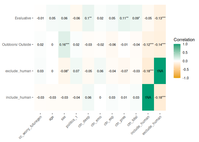 Gender is correlated with both refering to nature as Outside (women more likely to say nature is outside) and Excluding Humans (women more likely to exclude humans).