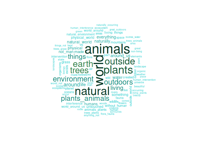 Outdoors/Outside | Mentions nature being “outside”, “outdoors”, or “out there”. | “The outdoors, things that are not man-made” |